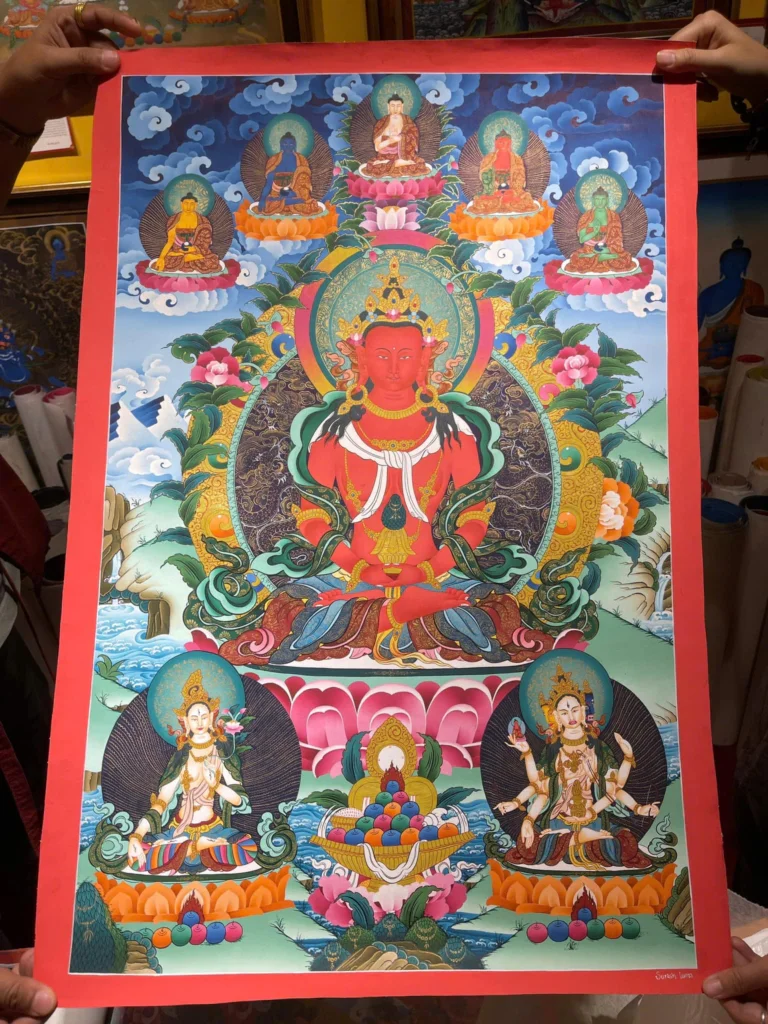 Trong lịch sử Phật giáo thì Phật A-di-đà được tôn thờ sớm nhất trong lịch sử, vào hàng a tăng kỳ kiếp trước có một vì vua sau khi nghe đức Phật thuyết pháp thì lập tức giác ngộ và từ bỏ ngai vàng mà đi theo đức Phật để quy y pháp danh là Pháp Tạng và đã thành Phật hiệu là A Di Đà. Thân hình của vị Phật này thường được vẽ bằng màu đỏ, tượng trưng cho màu mặt trời lặn phương Tây. Một tay của A-di-đà bắt ấn thiền định, tay kia giữ một cái bát, dấu hiệu của một giáo chủ, cũng có ảnh một tay đức phật cầm tòa sen, một tay xòe ra đưa xuống đất có ý nghĩa để dẫn dất chúng sinh lên tòa sen về cõi tịnh độ. Tòa sen tượng trưng cho sự thanh tịnh và hai con công là biểu hiện của sự thoát hiểm, thoát khổ. Tại Ấn Độ và Tây Tạng, người ta tin rằng con công có thể ăn tất cả những chất độc mà không bị ảnh hưởng gì.