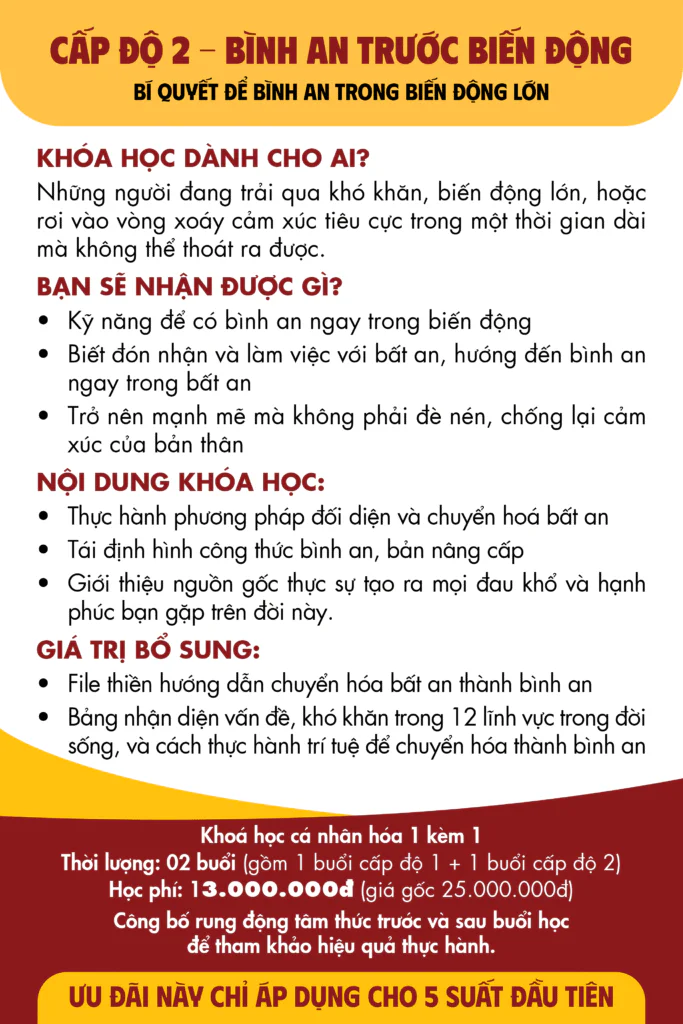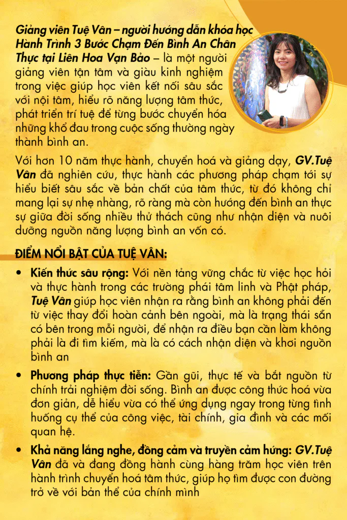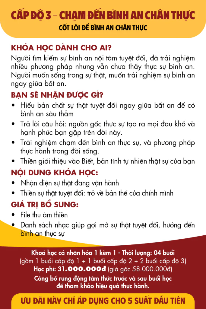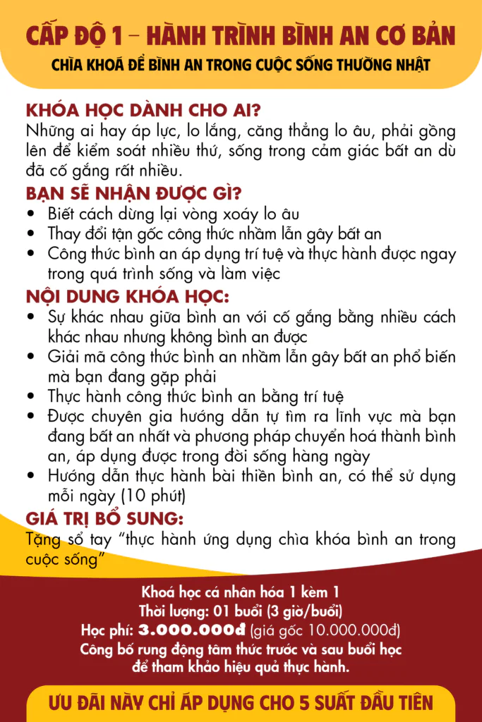 Nếu câu trả lời là “sự bình an thực sự, không phụ thuộc hoàn cảnh”, thì chuỗi khóa học Bình An 3 Cấp Độ chính là hành trình dành cho bạn.