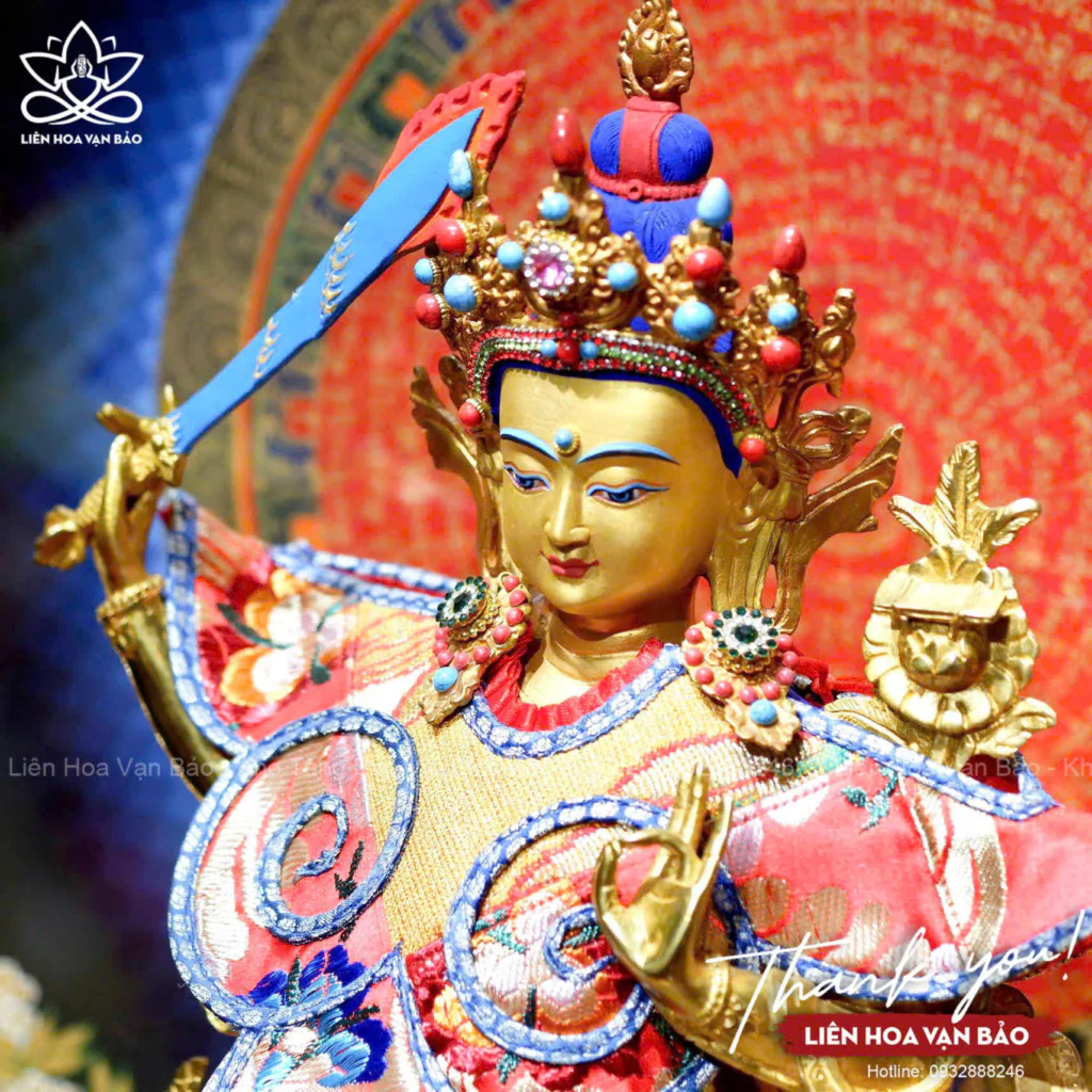 Tay phải Ngài cầm kiếm, dùng để triệt tiêu mọi vô minh và phiền não, những thứ đã trói buộc con người vào khổ đau và bất hạnh trong vòng sinh tử luân hồi. Tay trái Ngài giữ Kinh Bát Nhã, biểu tượng cho trí tuệ tối thượng trong nhà Phật. Khuôn mặt Ngài trẻ trung như một thanh niên mười sáu tuổi, thể hiện trí tuệ tuyệt đối luôn tươi mới và tràn đầy sức sống.